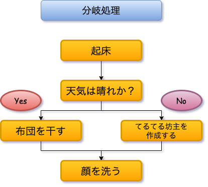 条件分岐とは、ある条件に対してYesかNoかによって異なる処理を行うことを示します。