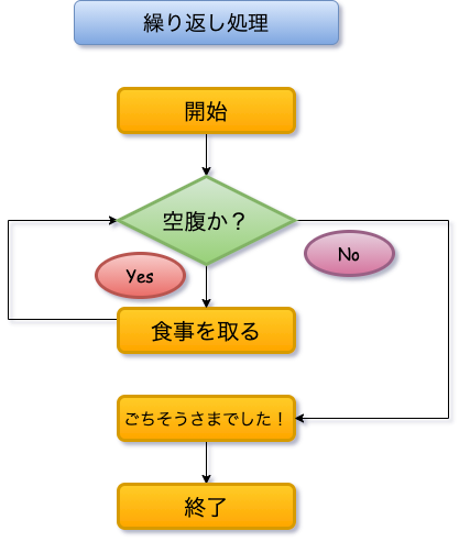 以下では、「空腹か?」という条件に対してYesであれば「食事を取る」、また、「空腹か?」という条件に戻ります。満腹になった場合は、Noを選択することになり「ごちそうさまでした!」に進んでいきます。