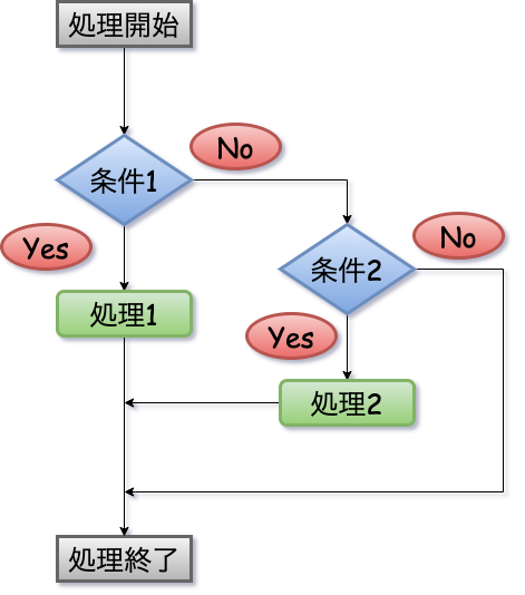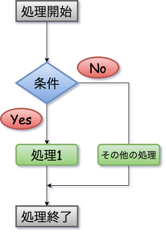 以下のように、ifの条件に当てはまるのならば処理1を行い、当てはまらない場合はelseブロック内のその他の処理を行う流れとなります。