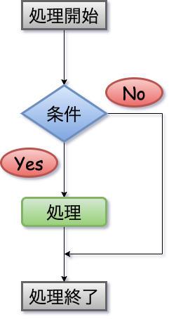 if文は、「もし〜なら〜の処理を行う。」というもし〜という条件に合致した場合にのみ処理を行うという最もシンプルな分岐処理です。