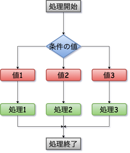 switch文は、特定の値を指定し、その値の内容に対してそれぞれ条件を値で書き、当てはまった条件ブロック内の処理を行います。