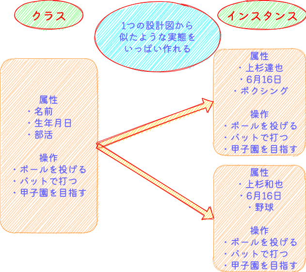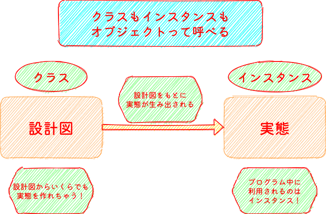 実際にプログラムとして書くのはクラス(設計図)ですが、プログラムを動かした際にクラス(設計図)をもとにインスタンスを作り出して、固有の情報を持たせてあげます。
