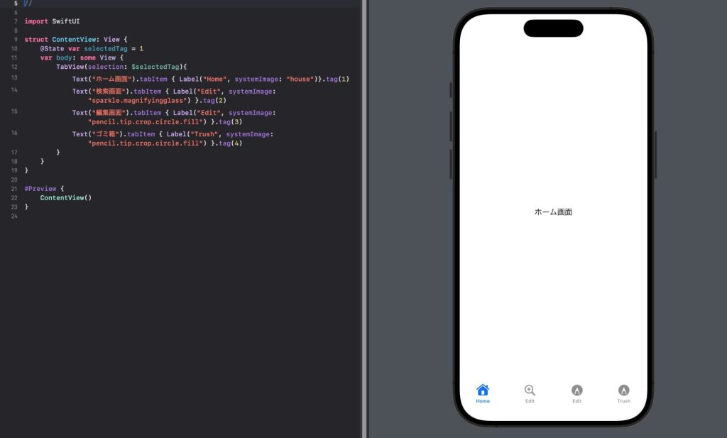 Text("ホーム画面").tabItem { Label("Home", systemImage: "house")}.tag(1)